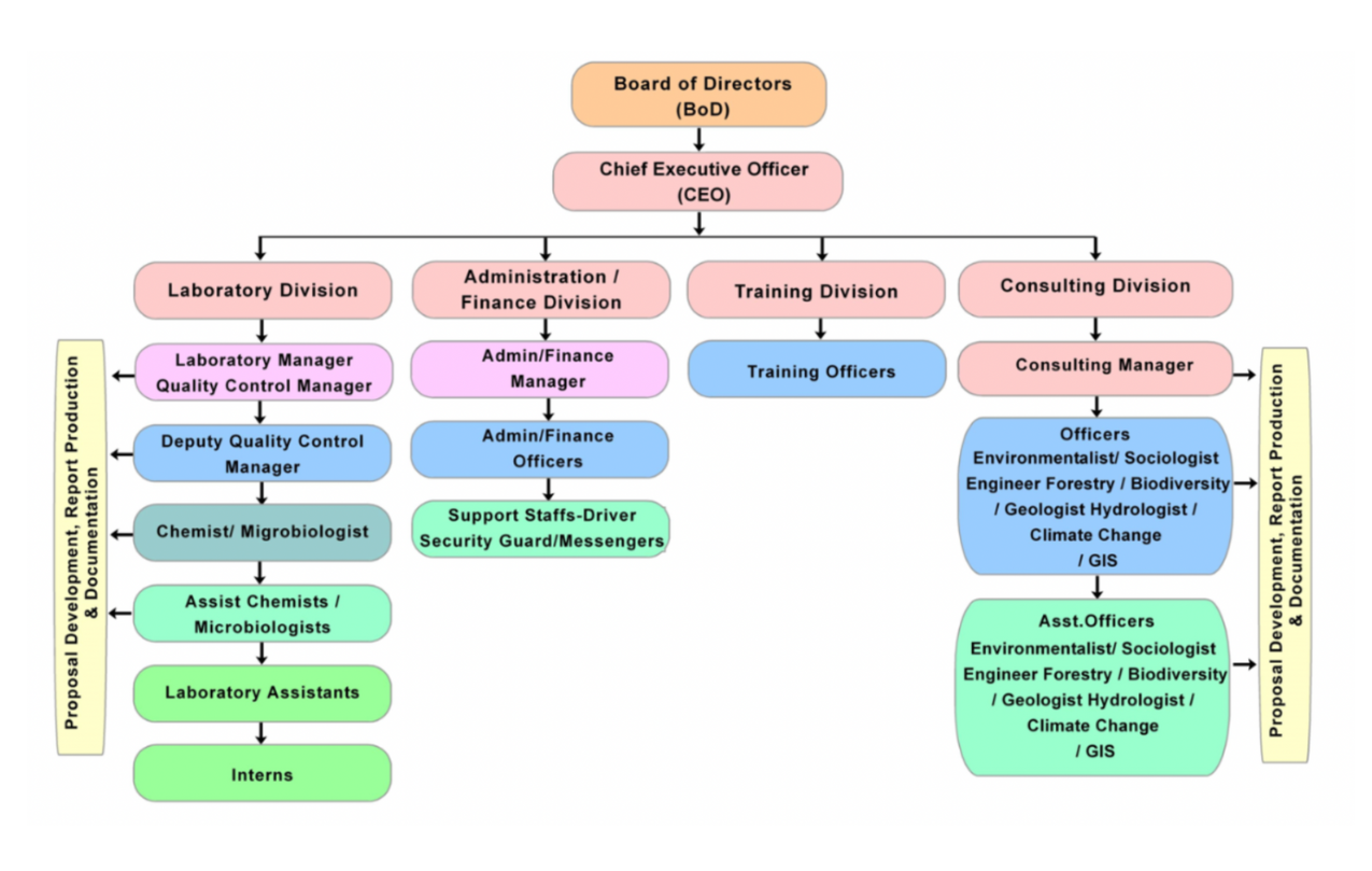 Nepal Environmental and Scientific Services Pvt. Ltd. organogram provides a clear visual representation of the company's hierarchy and reporting relationships, helping employees and stakeholders understand who is responsible for what within the organization. Components of the Organogram include components of the leadership team, divisions, units and support functions. It reflects our commitment to transparency, collaboration, and efficiency in all aspects of our business operations.
